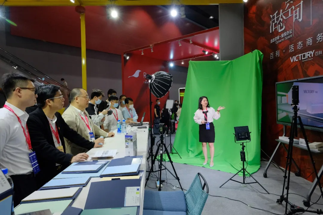 展位上,一名主持人站在純色的背景布前,與直播間的觀眾進(jìn)行互動。然而直播畫面卻呈現(xiàn)了“神奇一幕”:主持人仿佛置身于一個精裝的樣板間內(nèi),在向各位觀眾介紹背后的辦公空間。